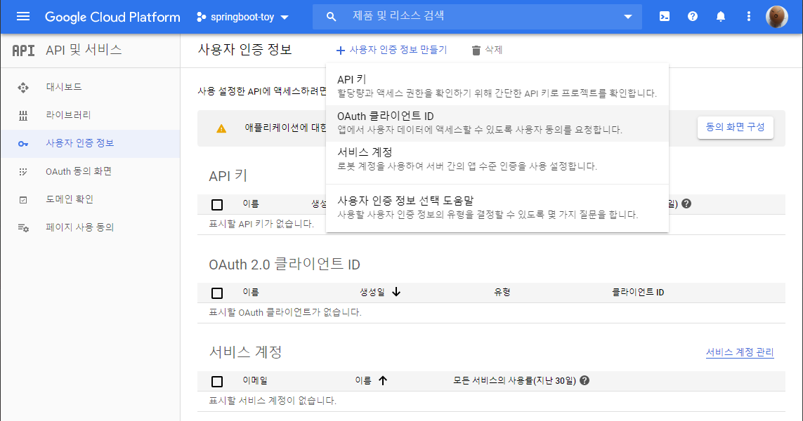 - 사용자 인증 정보 만들기 -> OAuth 클라이언트 ID
