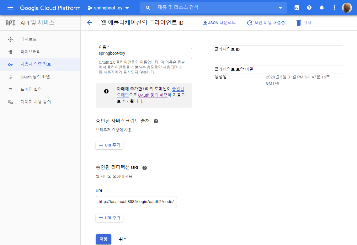 - OAuth 2.0 클라이언트 ID 생성 확인