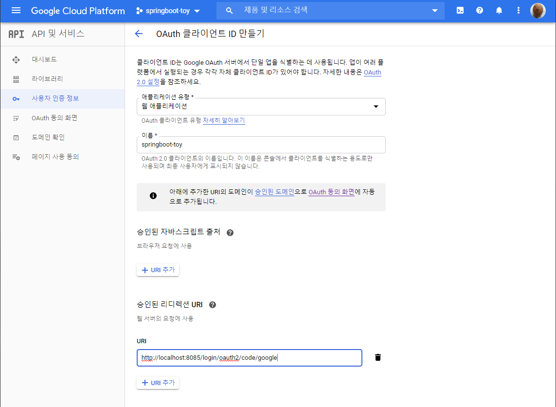 - 현재는 로컬에서 개발하기 때문에 http://localhost:8085/login/oauth2/code/google 등록
