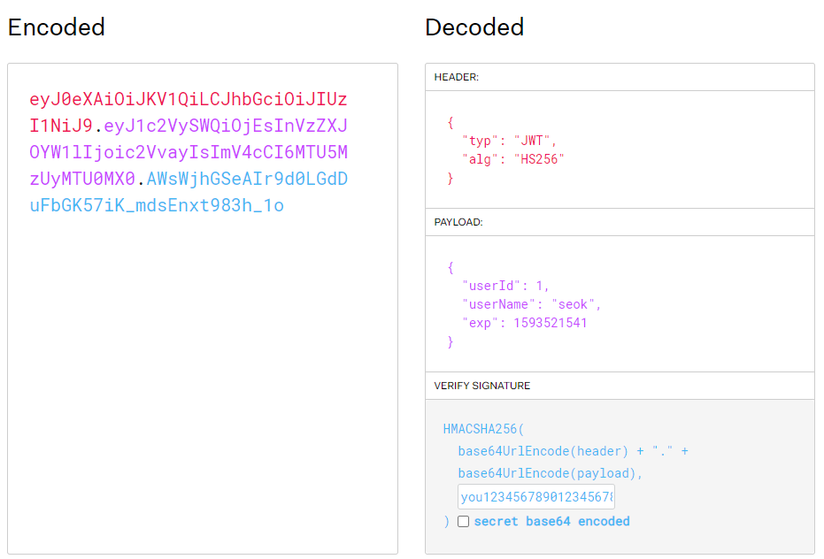 Base64 인코딩의 경우 "+", "/", "="이 포함되지만 JWT는 URI에서 파라미터로 사용할 수 있도록 URL-Safe 한 Base64url 인코딩을 사용한다.