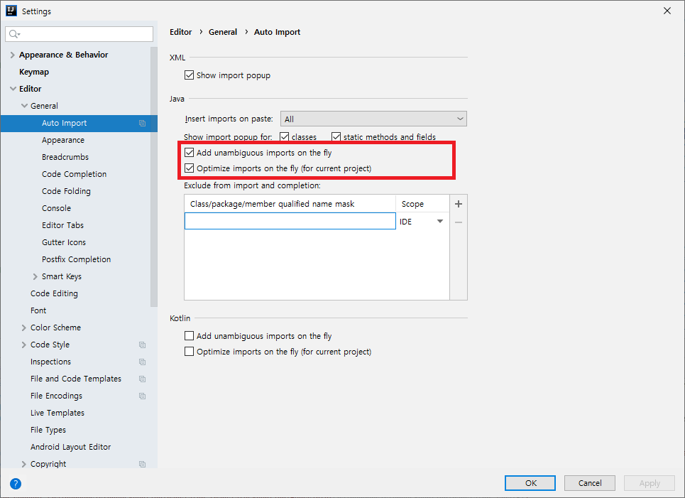 - 코드가 변경됨에 따라 자동으로 패키지 import문을 삽입/삭제해주는 옵션